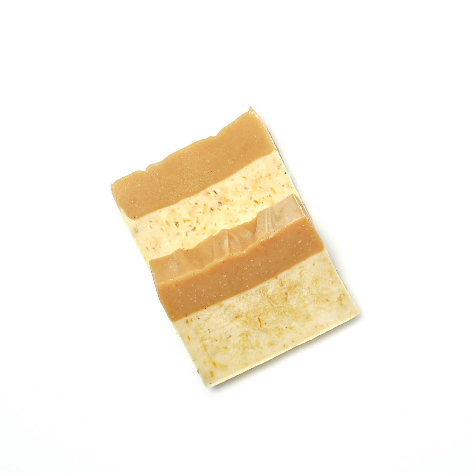 Ingredients: Sodium Olivate, Sodium Cocoate, Sodium Castorate, Sodium Sunflowerate, Beeswax, Glycerin, Citrus Aurantium Dulcis Peel Oil, Citrus Limon Peel Oil, Calendula Officinalis Flower, Curry Red, CI77891, Citral*, Limonene*