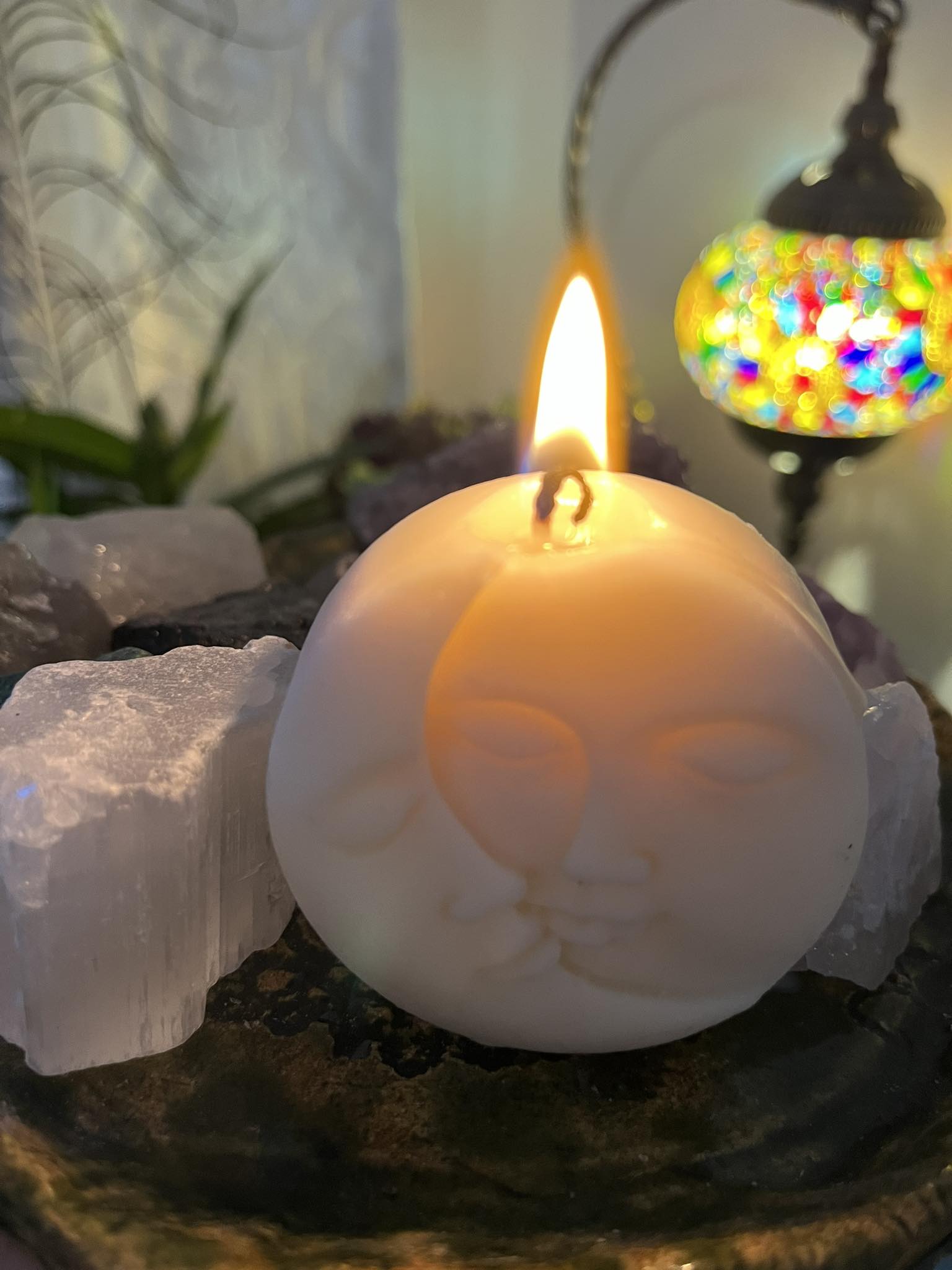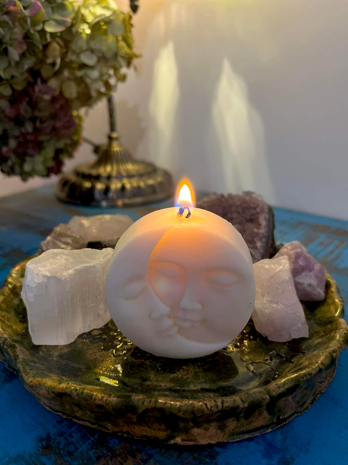 Świeca wolnostojąca w kształcie księżyca, wykonana własnoręcznie z naturalnego wosku sojowego.