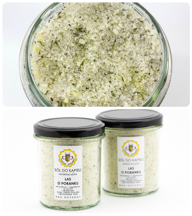 Składniki: sól morska, sól angielska – Epsom, tapioka, rozmaryn, olejki eteryczne: sosnowy, lawendowy, eukaliptusowy, miętowy, rozmarynowy, jodłowy