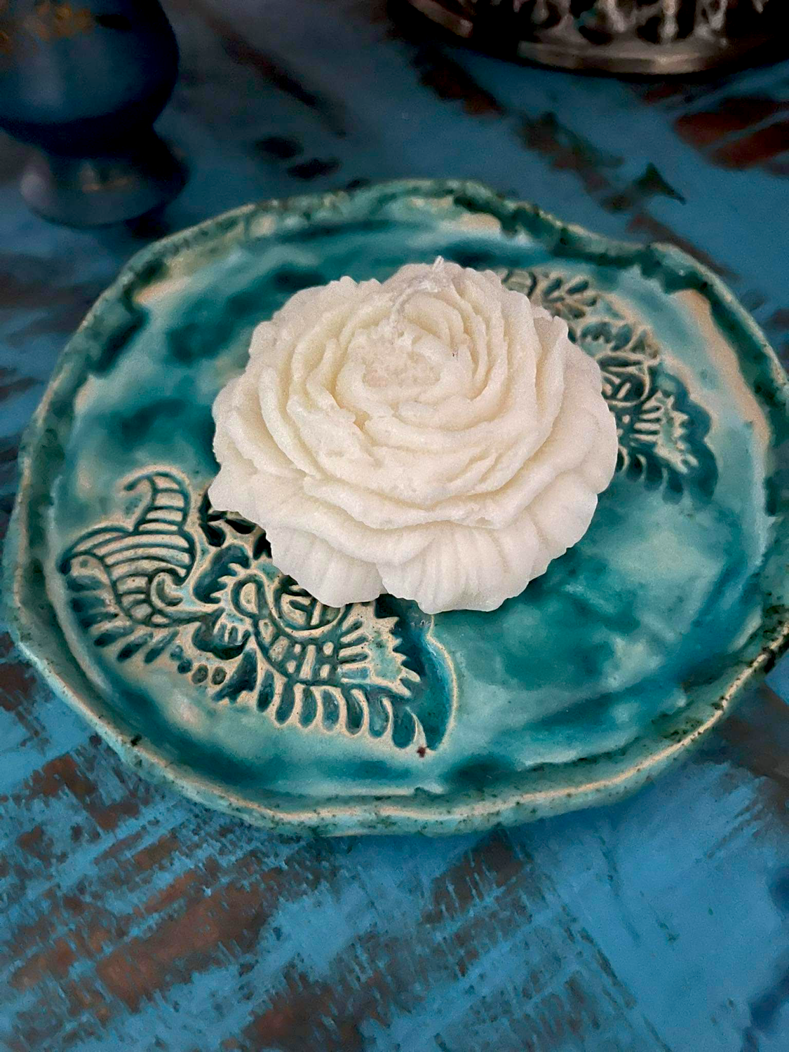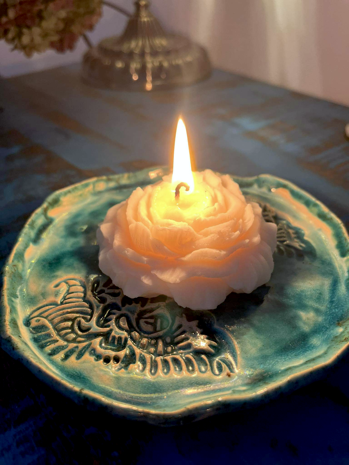 Świeca wolnostojąca, wykonana własnoręcznie z wosku sojowego.